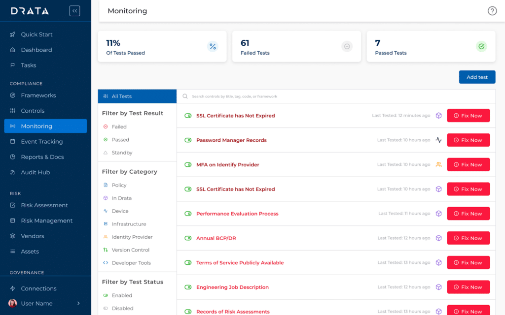 Drata’s core focus is streamlining audit readiness across frameworks such as SOC 2, ISO 27001, and HIPAA, with adjacent capabilities for risk management and trust center workflows. In this list, we think Drata sits closer to continuous compliance automation than to heavyweight enterprise IRM platforms or access-governance tools.